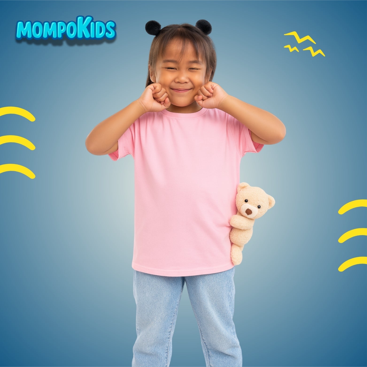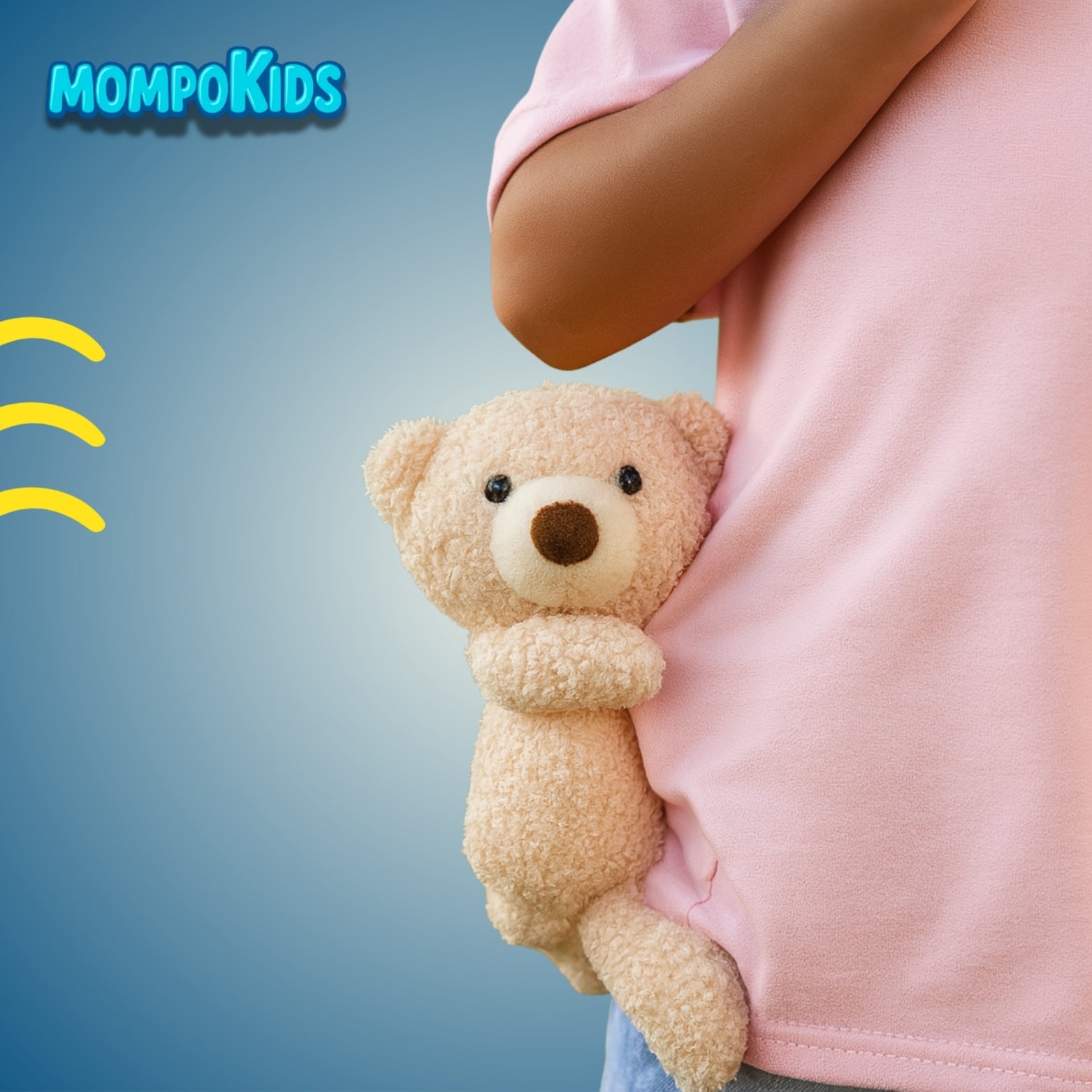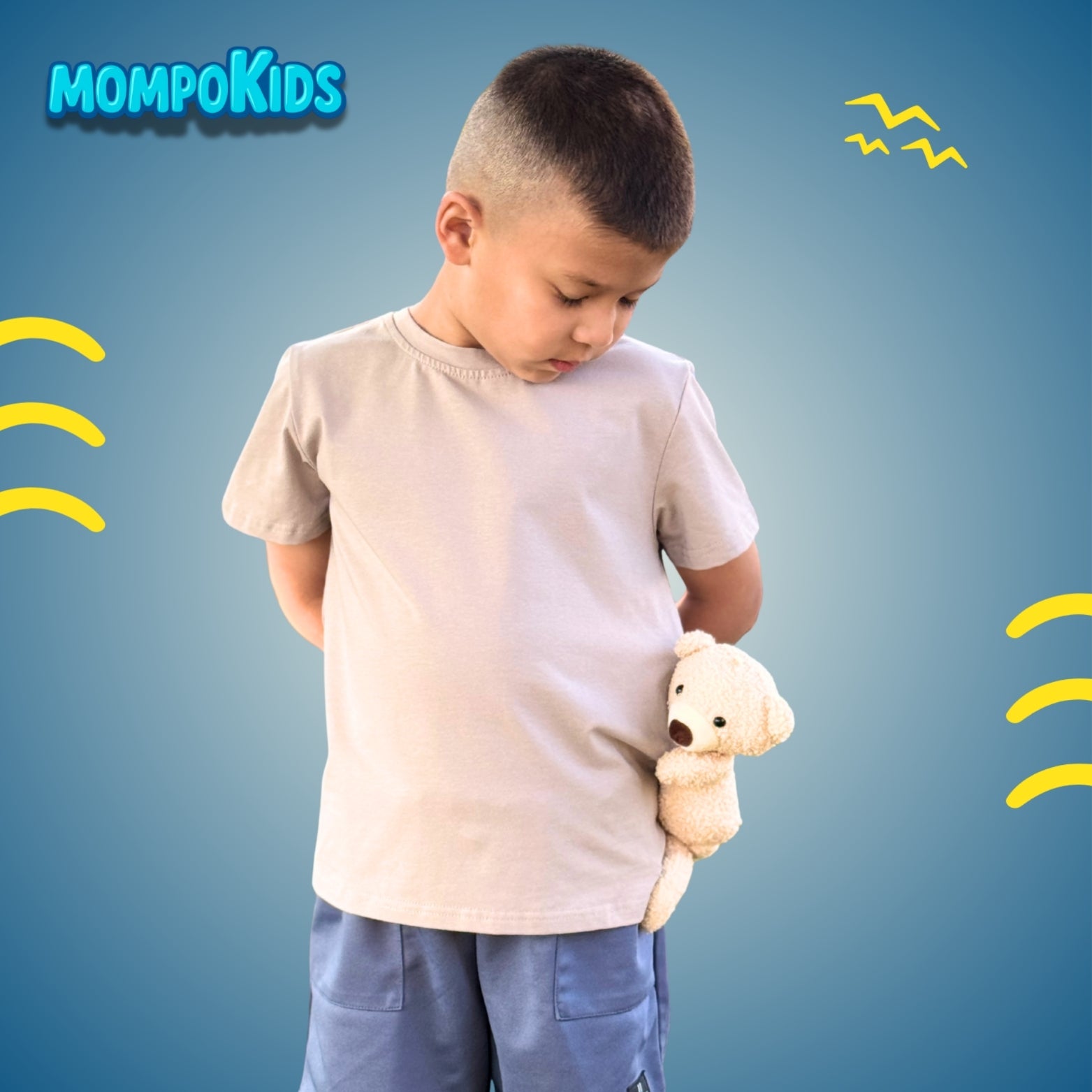 The MOMPOKIDS Teddy Bear T-Shirt with a plush teddy that hugs along (and can be removed for playtime), this tee brings both style and fun to every adventure. Perfect for school, playdates, and family outings.